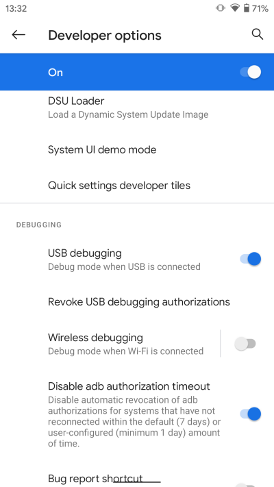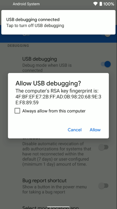 adb devicesand your device then click the prompt on your phone to allow USB debugging from your PC.Prompt on phone